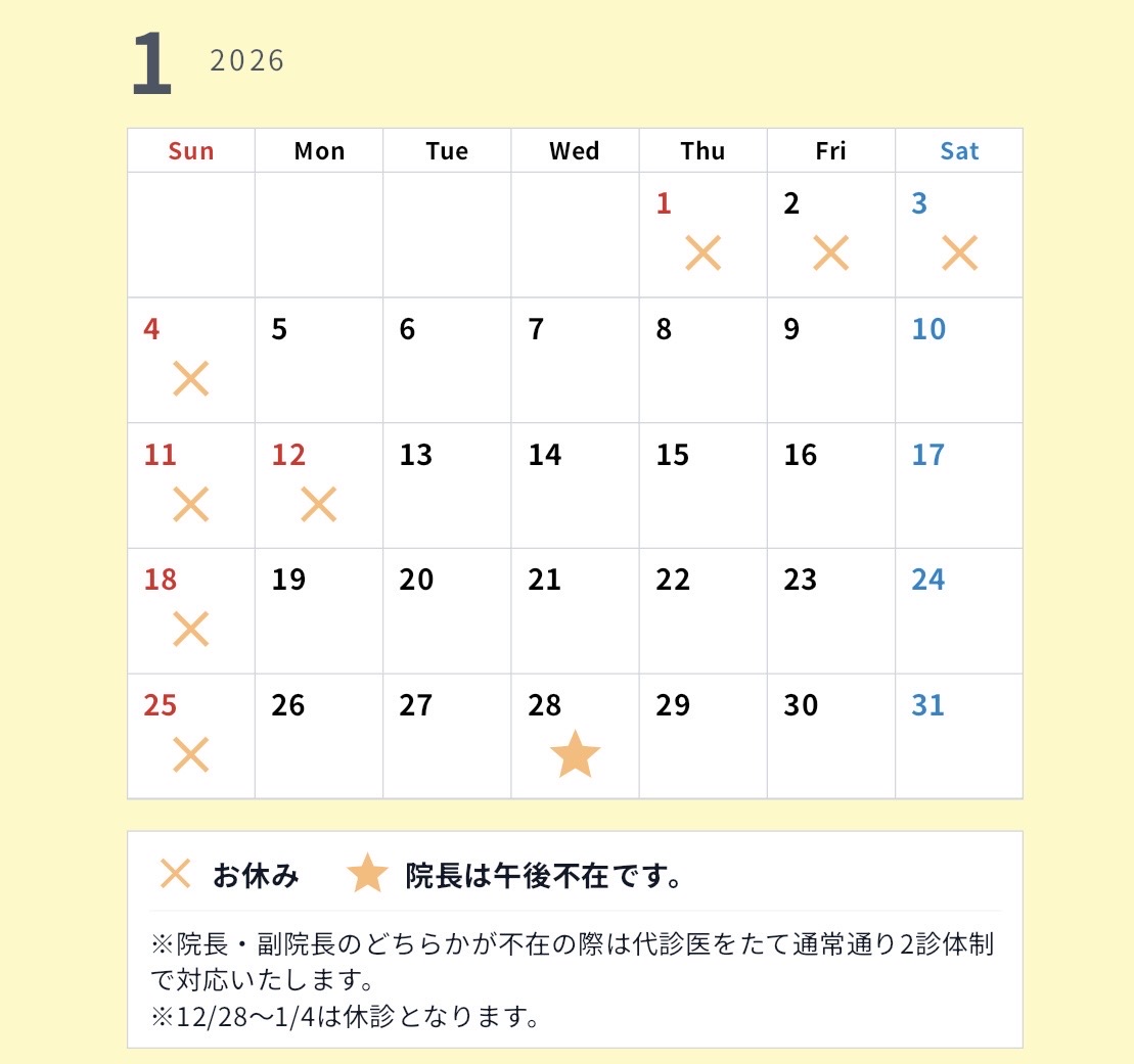 - 【TOPページの画面の下部にあります】12月、1月の診療カレンダーを更新しました。