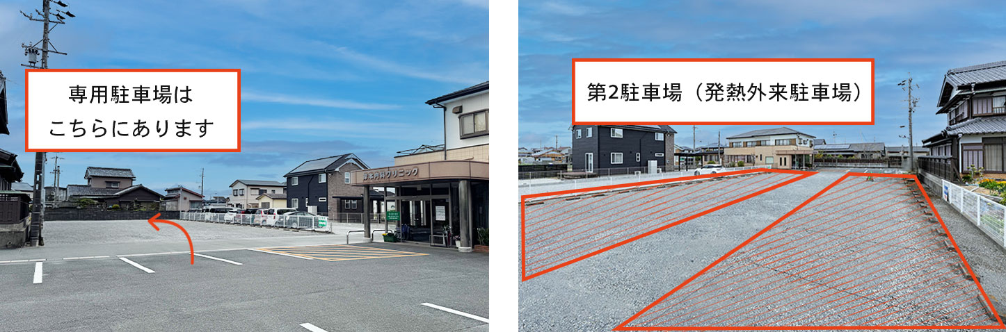 発熱外来をご利用の際は、下記の専用駐車場をご利用ください。 空きがある場合は、よりクリニックに近い場所への移動にご協力いただけますと、検査をスムーズに行うことができます。ご不便をおかけしますが、皆様のご理解とご協力をお願いいたします。